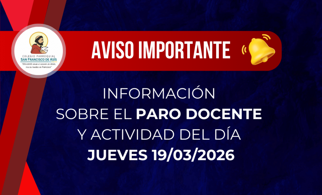 En virtud del PARO DOCENTE convocado para mañana JUEVES 19/03/2026, les comunicamos cómo se desarrollarán las actividades de la jornada en cada nivel educativo: NIVEL INICIAL: NO TIENE CLASES. NIVEL PRIMARIO: Turno Mañana: Sólo tiene clases 2° grado «A.» EL RESTO NO TIENE CLASES. Turno Tarde: NO TIENE CLASES. NIVEL SECUNDARIO: A continuación les comunicamos cómo […]